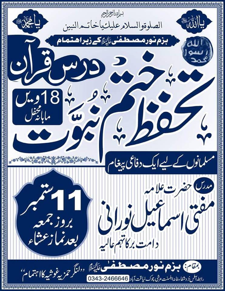 اس اجتماع میں اورادووظائف کا ورد،اللہ عزوجل کے ناموں کاذکر اور آخر میں حضرتِ علامہ مولانا بشیر فاروقی اجتماعی رقّت انگیز ذکرودعا فرمائیں گے۔ ہر اتوار عصر تا مغرب نفلی اعتکاف ،جامع مسجد حضرت ِ امیرِ حمزہ رضی اللہ عنہ ،گلبہار چورنگی،عقب پی ایس او پٹرول پمپ ،ناظم آباد نمبر ۲ کراچی پاکستان ...