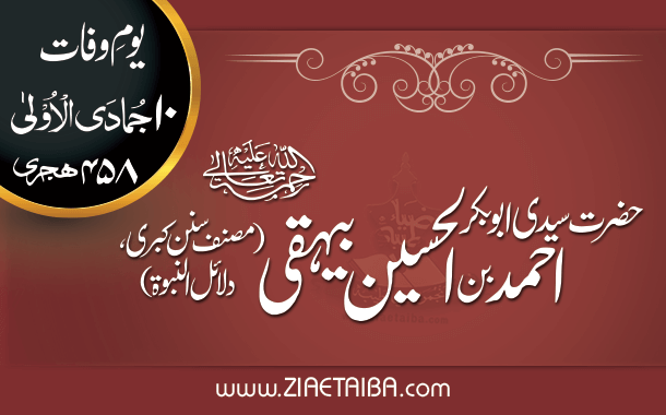 امام بیہقی صاحب سنن کبریٰ رحمۃ اللہ تعالیٰ علیہ نام و نسب: امام ابو بکر احمد بن حسین بن علی بن عبداللہ بن موسیٰ نیشاپوری، خسروجردی، بیہقی۔ رحمۃ اللہ علیہ تاریخِ ولادت: آپ رحمۃ اللہ علیہ شعبان 384 ھ میں بیہق کے علاقہ "خسرو جرد"جونیشاپور کا نواحی علاقہ ہے، میں پیدا ہوئے ۔ تحصیلِ علم:امام بیہقی رحمۃ اللہ علیہ نے کثیر اساتذہ کے سامنے زانؤ ےتلمذ طے کرکے مختلف علوم وفنون پر عبور حاصل کیا۔آپ کے اساتذہ کرام میں انتہائی شہرت کے حامل یہ حضرات ہیں:...