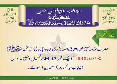 حضرت علّامہ مفتی محمد اشفاق احمدرضوی بن حاجی ولی الرّحمٰن رحمۃ اللہ تعالیٰ علیہ یکم جنوری1948ء کو چک نمبرAH-12تحصیل و ضلع خانیوال (پنجاب، پاکستان) میں پیدا ہوئے۔